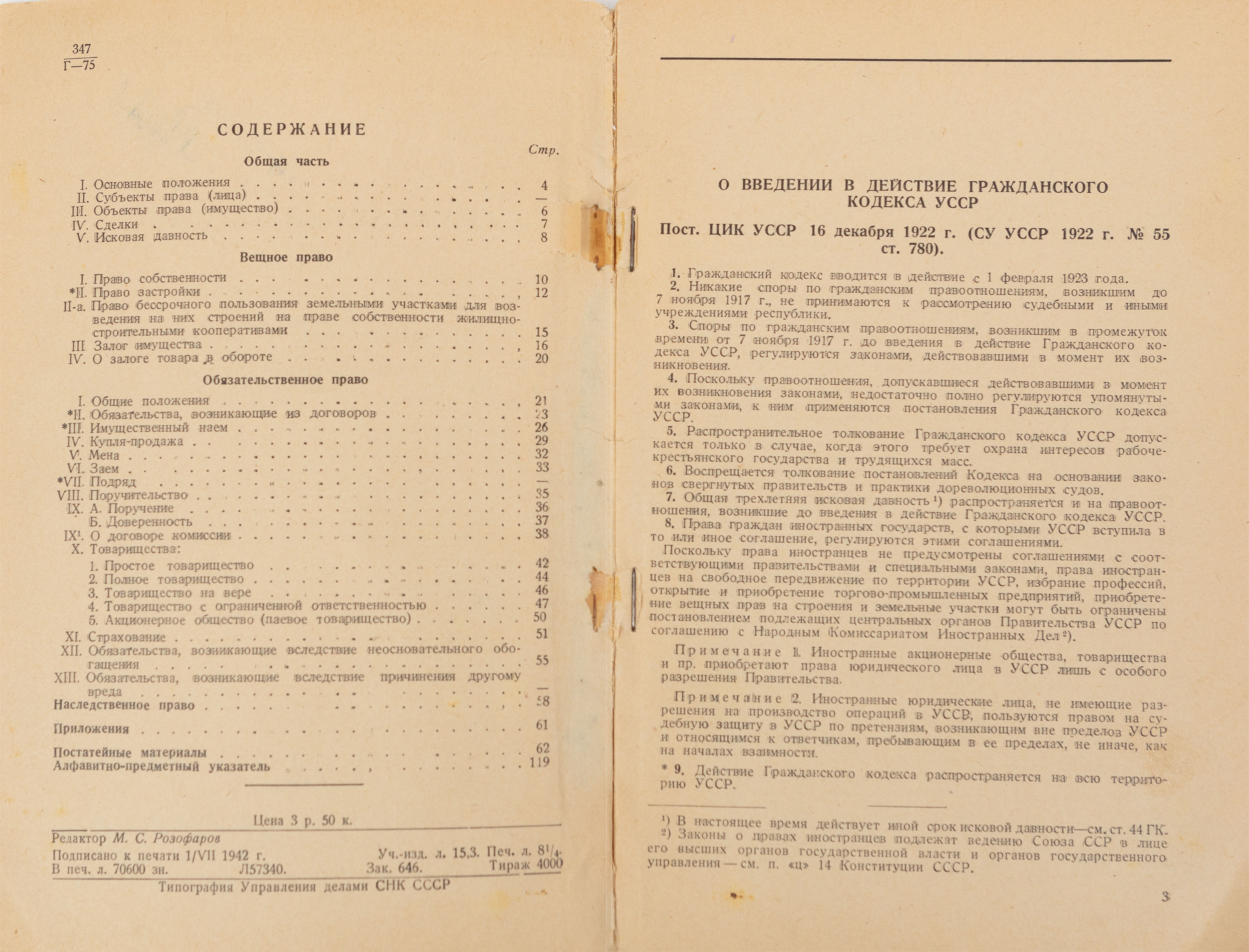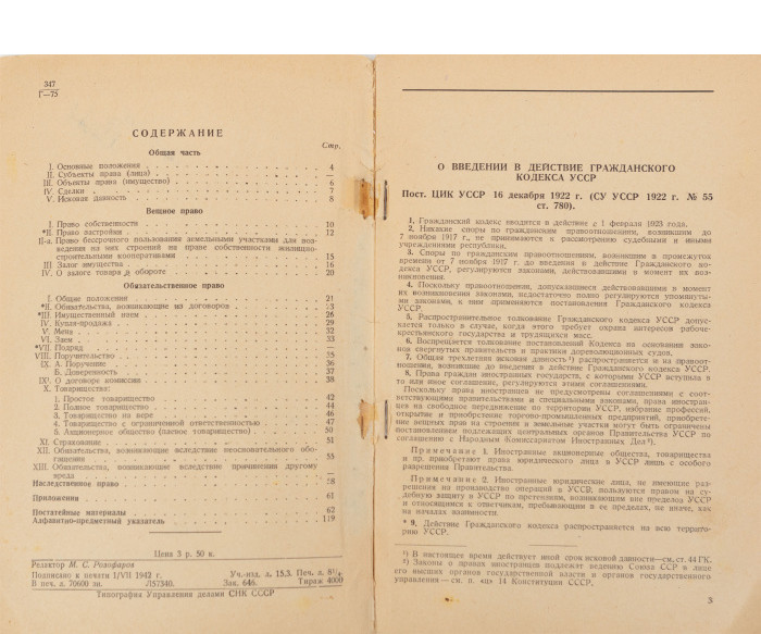 Цивільний кодекс УРСР 1942 р. містить розділи «Общая часть», «Вещное право», «Обязательное право», «Наследственное право» та інші.
