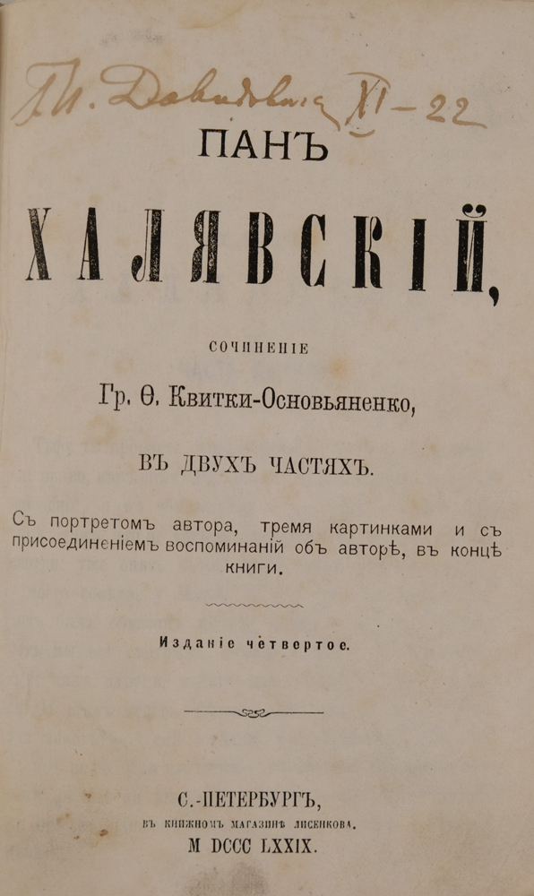[Квитка-Основьяненко Гр.] Панъ Халявскій / сочиненіе Гр.Квитки-Основьяненко: въ двухъ частяхъ. Съ портретомъ автора, тремя картинками и съ присоединеніемъ воспоминаній объ авторѣ, въ концѣ книги.