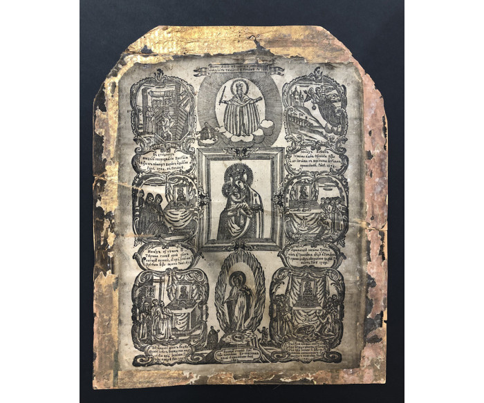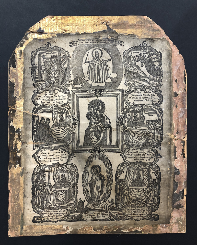 Дана гравюра є одним із перших дуже чітких і якісних відбитків, виконаних з дерев’яного кліше. На гравюрі зображено найулюбленіші сюжети з історії монастиря з точними датами, що є дуже цінним. У центрі — «Чудотворна ікона Почаївської Богородиці», нагорі — «Явління Божої Матері і Блаженного Іова Железа в час рати Турецкой в Почаєві. Року 1675», у клеймах — «Явління Божої Матері на горі Почаївській в стовпі вогняному 1340 року», «Зцілення від сліпоти Філіпа Козинського, брата фундаторки монастиря Анни Гойської 1597 року», «Чудо про монаха, який приніс власну голову, усічену турком, на гору Почаївську 1673 року», «Полонений турками монах, принесений до Почаєва янголом 1674 року», «Юнак, що впав до колодязя, чудесно спасенний Богородицею 1704 року», «Воскресіння померлої дитини з Жовкви 1710 року», «Зцілення хворого з Терембовля 1739 року».