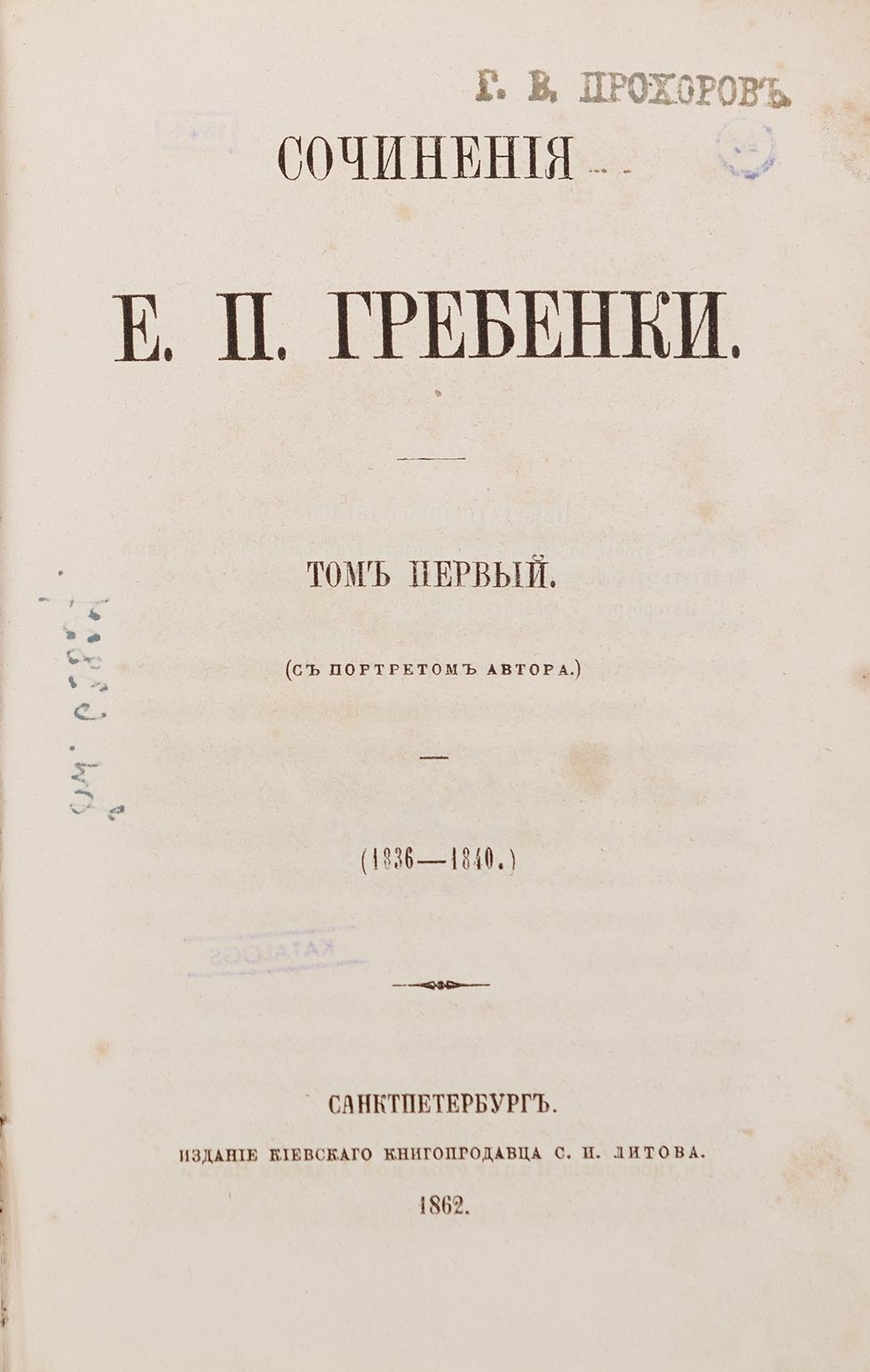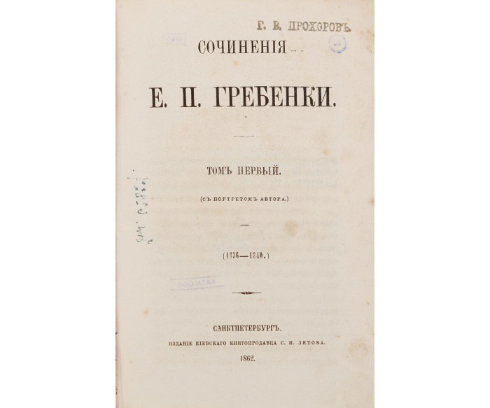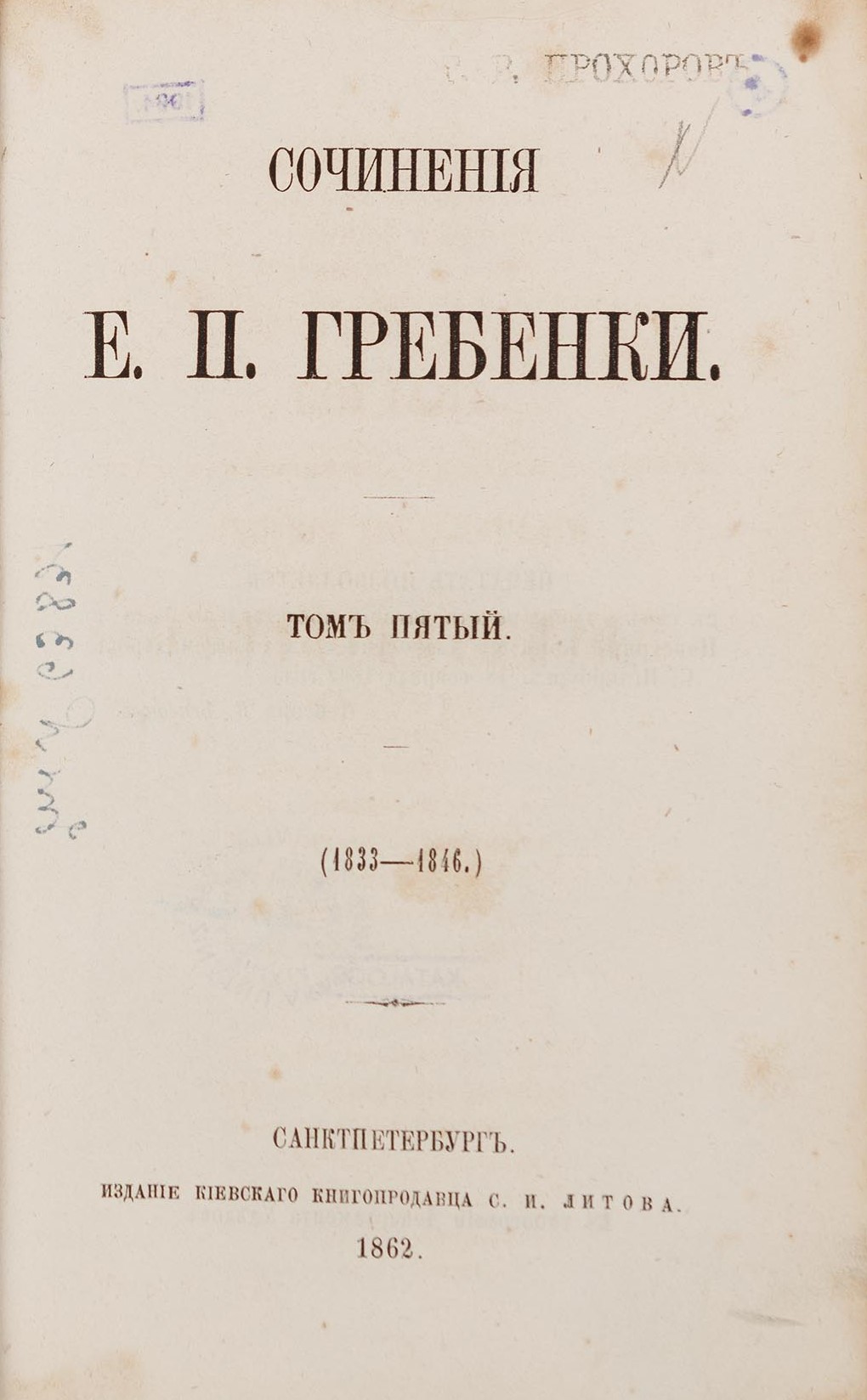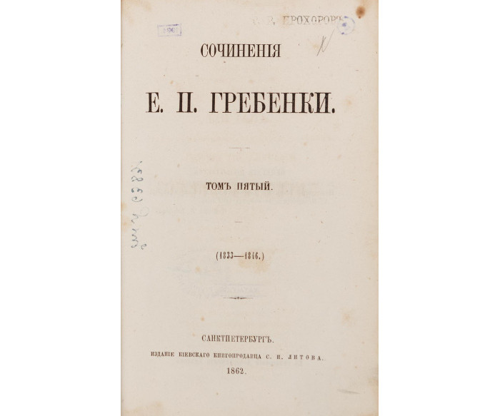 СанктПетербургъ: Ізданіе Кіевскаго книгопродавца С. И. Литова; Въ типографіи Императорской Академіи наукъ, 1862. Томъ первый (съ портретомъ автора): (1836–1840). — [1] арк., XLII, 476 с.: портр. — 19,2 × 12,5 × 3 см. Томъ второй: (1841–1843). — 520 с. — 19,2 × 12,9 × 2,9 см. Томъ третій: (1844). — 494 с. — 19,2 × 12,6 × 2,9 см. Томъ четвертый: (1845–1848). — 496 с. — 19,2 × 12,6 × 2,8 см. Томъ пятый: (1833–1846). — Въ типографіи Департамента Удѣловъ. — 436 с., ІV. — 19,2 × 12,6 × 2,6 см.