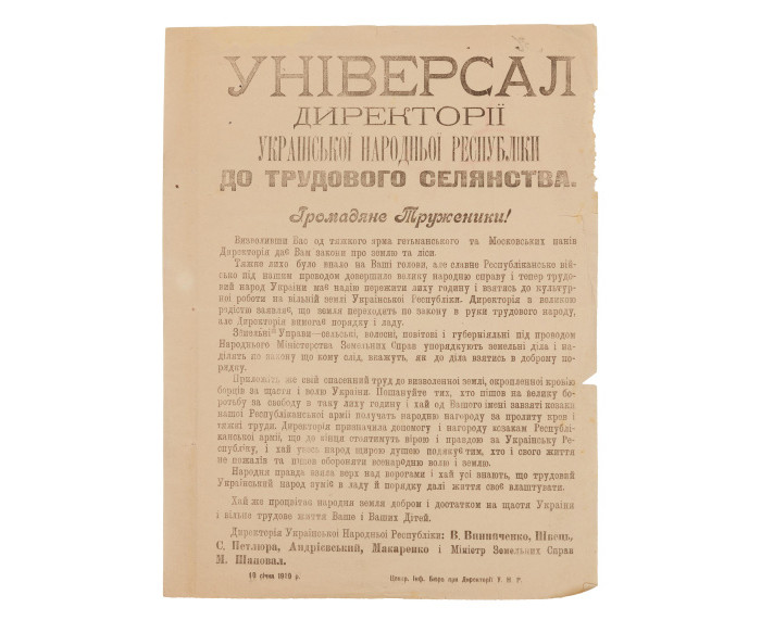 Універсал Директорії УНР до трудового селянства доводив до відома положення нового земельного закону, виданого 8 січня 1919 року. В універсалі йдеться про те, «що земля переходить по закону в руки трудового народу, але Директорія вимогає порядку і ладу». Насправді земля залишалась державною. Земельні наділи, які на той час перебували у власності селян і не перевищували 15 десятин, залишались непорушними. Нові земельні наділи мали надаватися у вічне користування малоземельним і безземельним селянам і складати від 5 до 15 десятин.