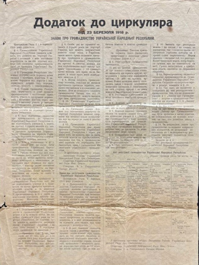 «Закон про громадянство Української Народної Республіки» було ухвалено Центральною Радою 2 березня 1918 року. Стати громадянином УНР могла будь-яка людина, що народилася та постійно мешкала на території України й отримала свідоцтво про приналежність до громадян УНР. Порядок набуття громадянства з обов’язковим принесенням урочистої присяги визначав «Закон про реєстрацію громадянства Української Народної Республіки», ухвалений Центральної Радою 4 березня 1918 року. Громадяни УНР могли обіймати посади на державній службі, брати участь у виборах і бути обраними до українських законодавчих установ та органів місцевого самоврядування.