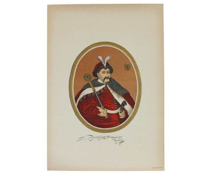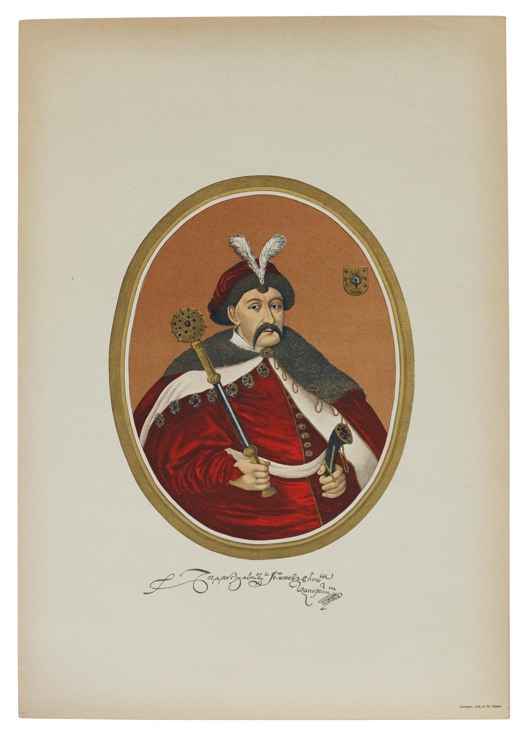 Портрет українського військового, політичного й державного діяча, гетьмана Війська Запорозького, Богдана Хмельницького (1595–1657) надруковано з офорту фламандського картографа, художника та гравера Вільгельма Гондіуса (1598–1652/1658), свідка повстання 1648 року. У 1651 р. Гондіус створив найвідоміший прижиттєвий портрет Хмельницького, на який згодом спиралися автори численних зображень гетьмана.