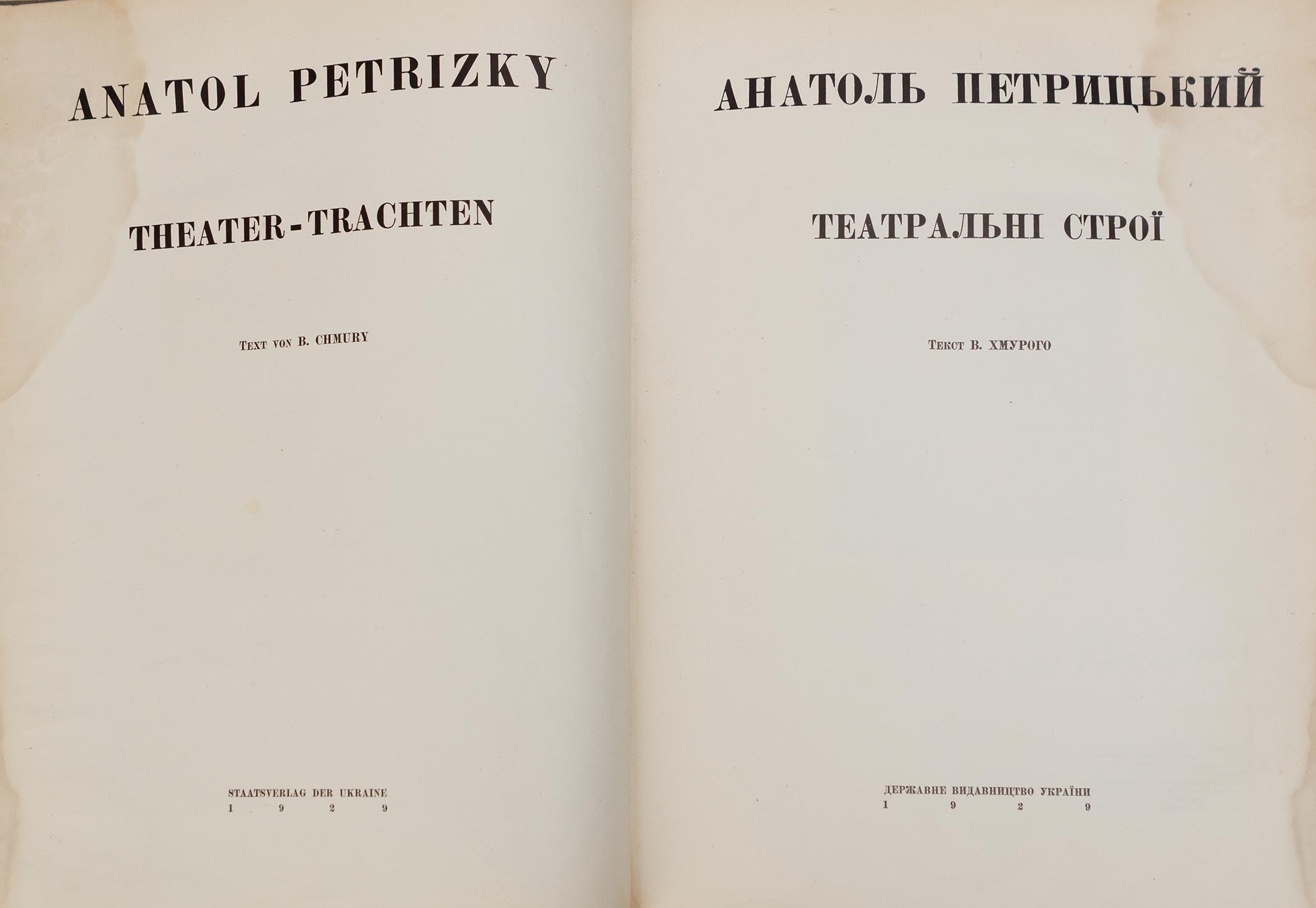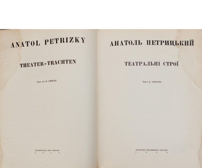 2 000–3 000 $Альбом ескізів театральних декорацій і костюмів визначного українського художника-авангардиста, сценографа-новатора Анатолія Петрицького (1895–1964), виконаних у яскраво конструктивістському стилі. Це видання мав у своїй бібліотеці Пабло Пікассо, а Олександра Екстер використовувала його, викладаючи основи композиції. У 1940–х рр. «формалістичний» альбом «Театральні строї» фігурував як компромат на художника, котрому «не місце серед професури Київського художнього інституту». Анатоль Петрицький розшукував примірники цього видання і знищував їх.