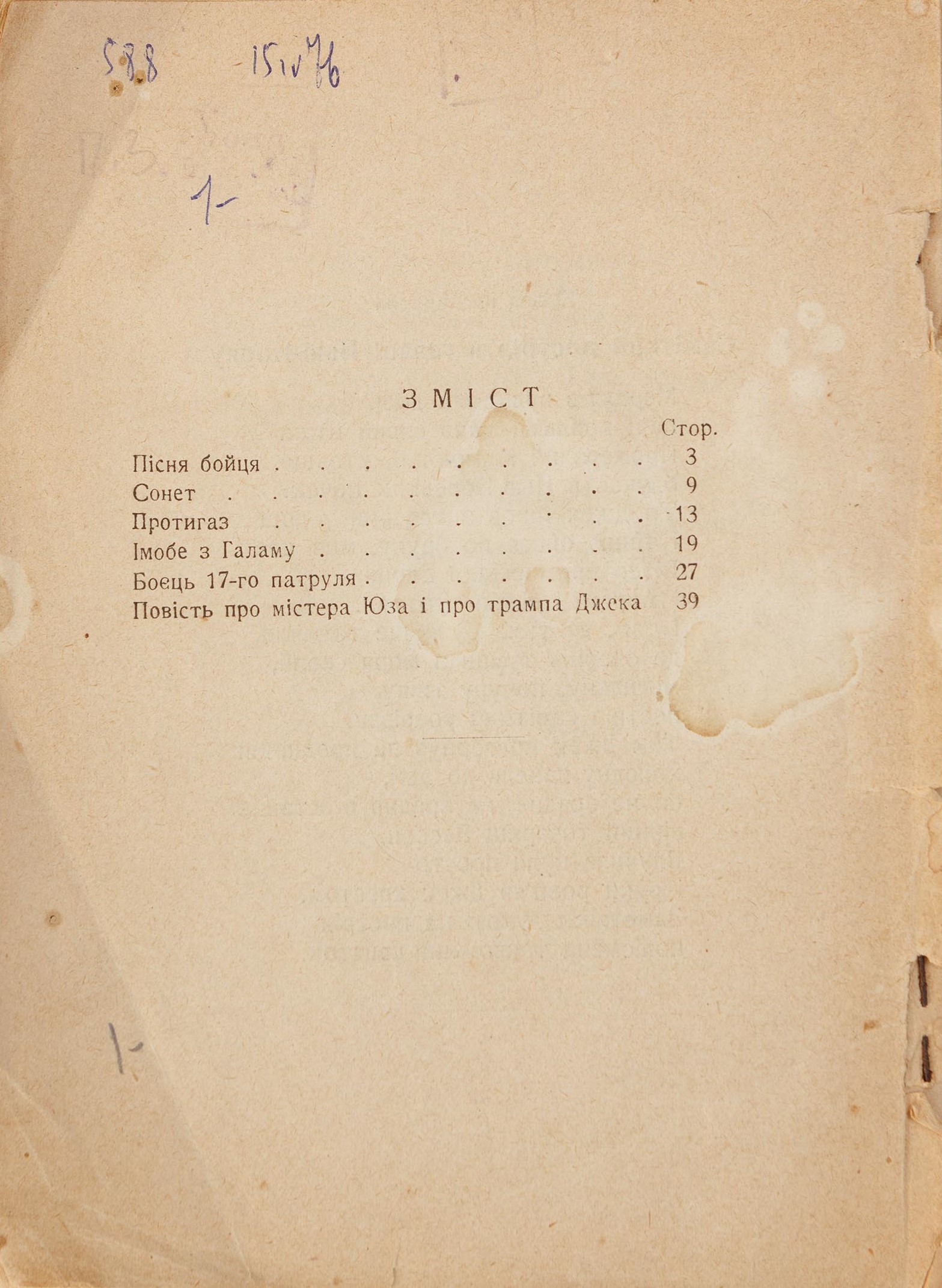 Перше видання першої збірки поезій українського поета, перекладача і культуролога Миколи Бажана (1904–1983), яка була присвячена збройним конфліктам на території України 1917–1920 років. Збірник має ознаки футуризму та конструктивізму, до нього увійшли такі поезії: «Пісня бойця», «Сонет», «Протигаз», «Імобе з Галаму», «Боєць 17-го патруля» та ін.