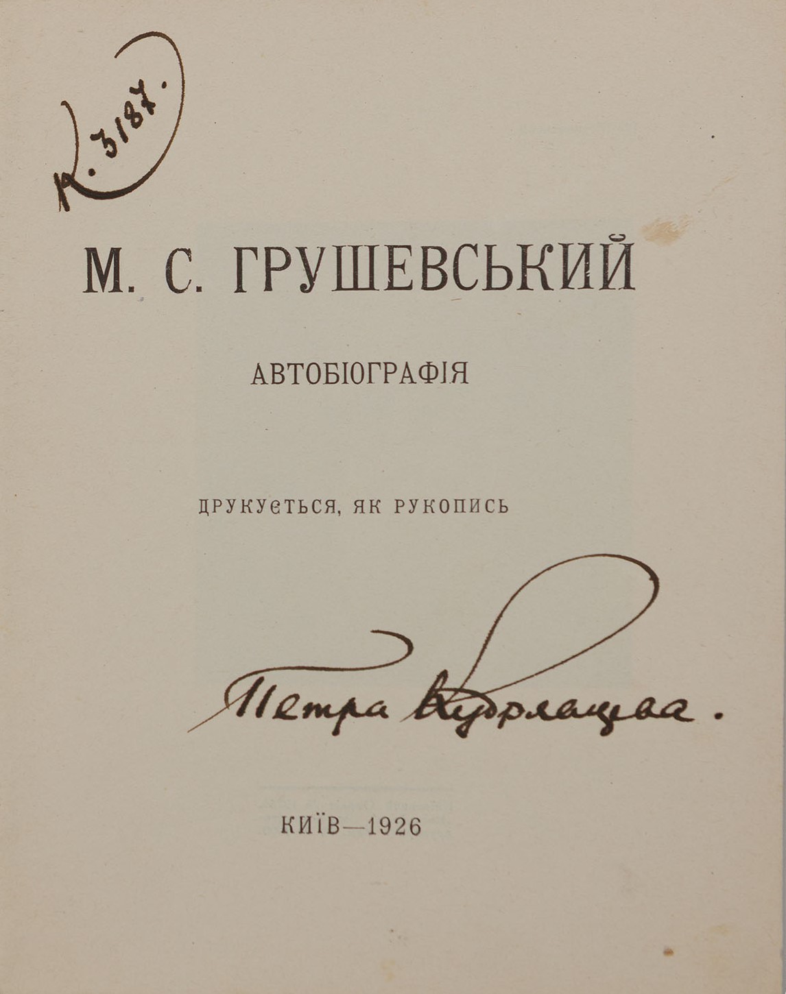 Провенанс: на обкладинці й титульному аркуші підпис «Петра Кудрявцева К. 3187».