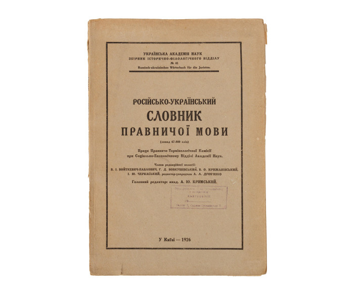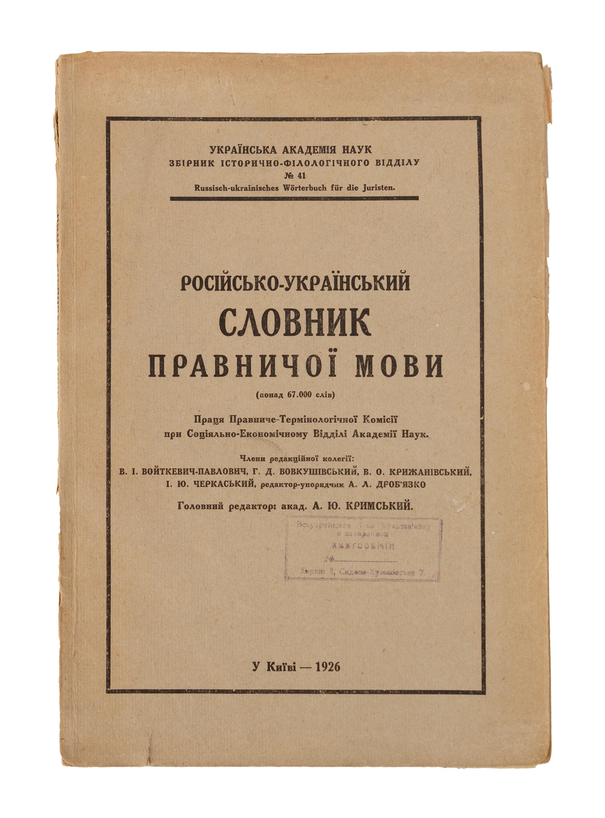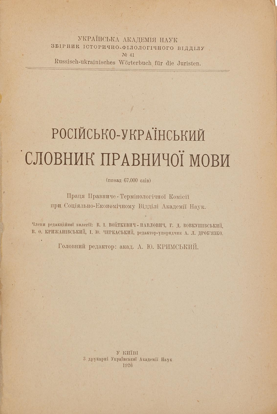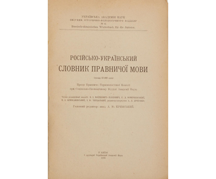Праця Правниче-Термінологічної Комісії при Соціяльно-Економічному Відділі Академії Наук; головний редактор: акад. А. Ю. Кримський