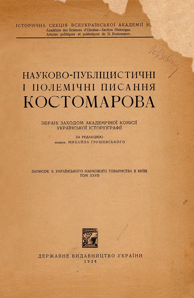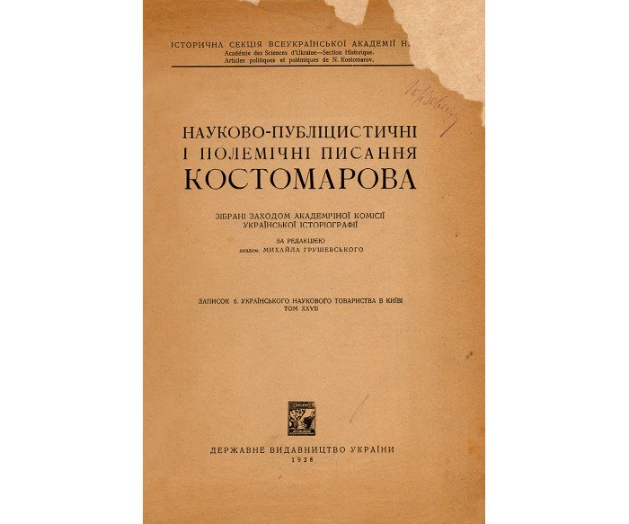 Зібрані Заходом академічної комісії української історіографії / історична секція Всеукраїнської академії наук; за ред. М. Грушевського. [Київ]: Державне видавництво України. — XXI, [V], 315, [1] c. / Записок 6. Українського наукового товариства в Київі, т. ХХVII. — 27,7 × 13,2 × 2,1 см. В індивідуальній складеній (шкіра, тканина) палітурі. Орнаментально-шрифтове тиснення золотом на корінці. Форзаци, каптал, ляссе. Незначні потертості та забруднення. Позначки олівцем. На титульному аркуші нерозбір ливий підпис. Книга має наукову, історико-культурну цінність і становить колекційний інтерес.