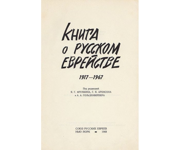 Под ред. Я. Фрумкина, Г. Аронсона и А. Гольденвейзера. Нью-Йорк: Союз русских евреев. — IX, 467, [1] c. — 22,9 × 15 × 2,1 см. В оригінальній обкладинці. Незначні потертості та забруднення. Позначки кульковою ручкою. Художнє оформ лення обкладинки — E. Schloss. Книга має наукову, історико-культурну цінність і становить колекційний інтерес.