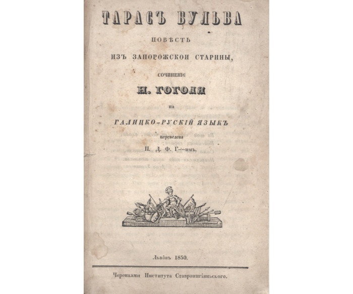 Рідкісне прижиттєве видання твору визначного українського письменника, класика світової літератури Миколи Васильовича Гоголя (1809-1852). Представлено перший український переклад повісті Гоголя «Тарас Бульба» здійснений Петром Головацьким.