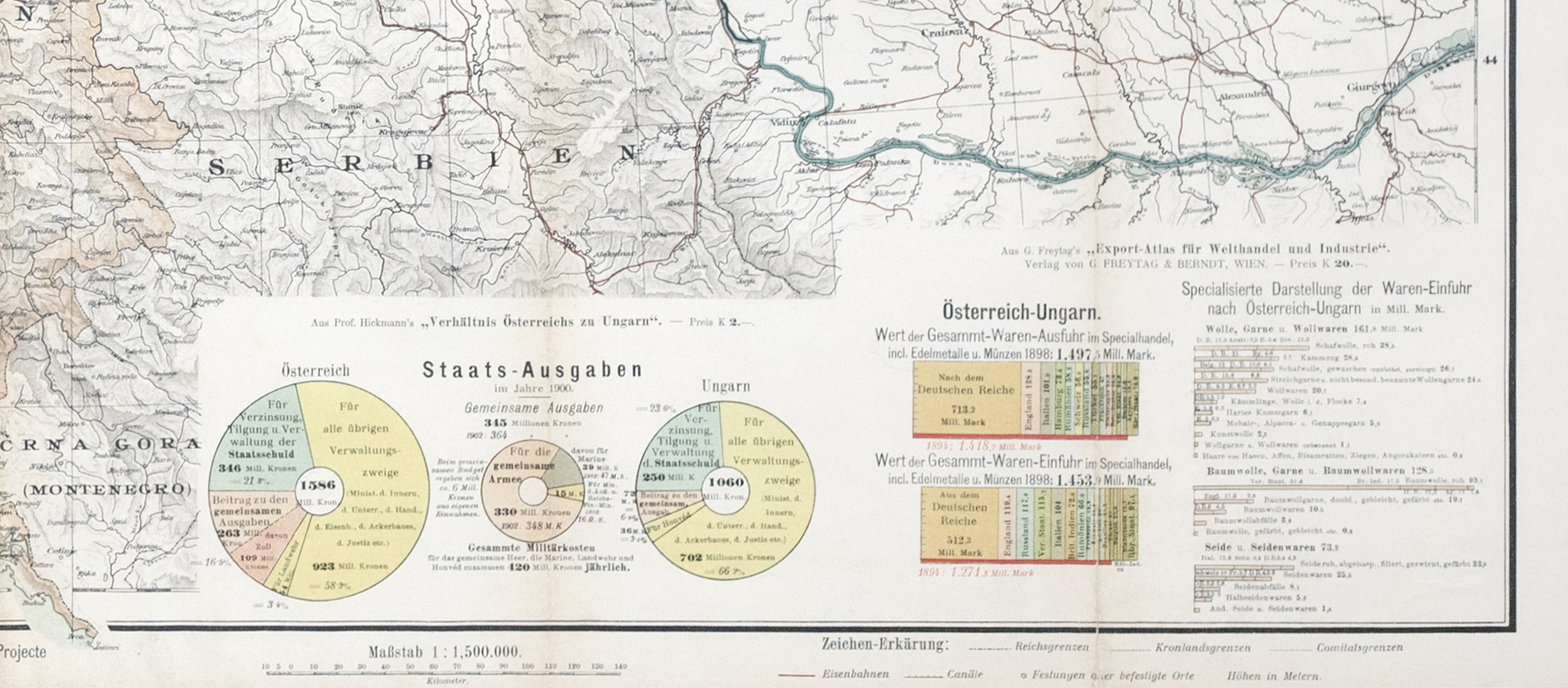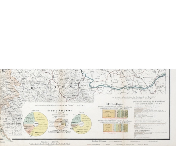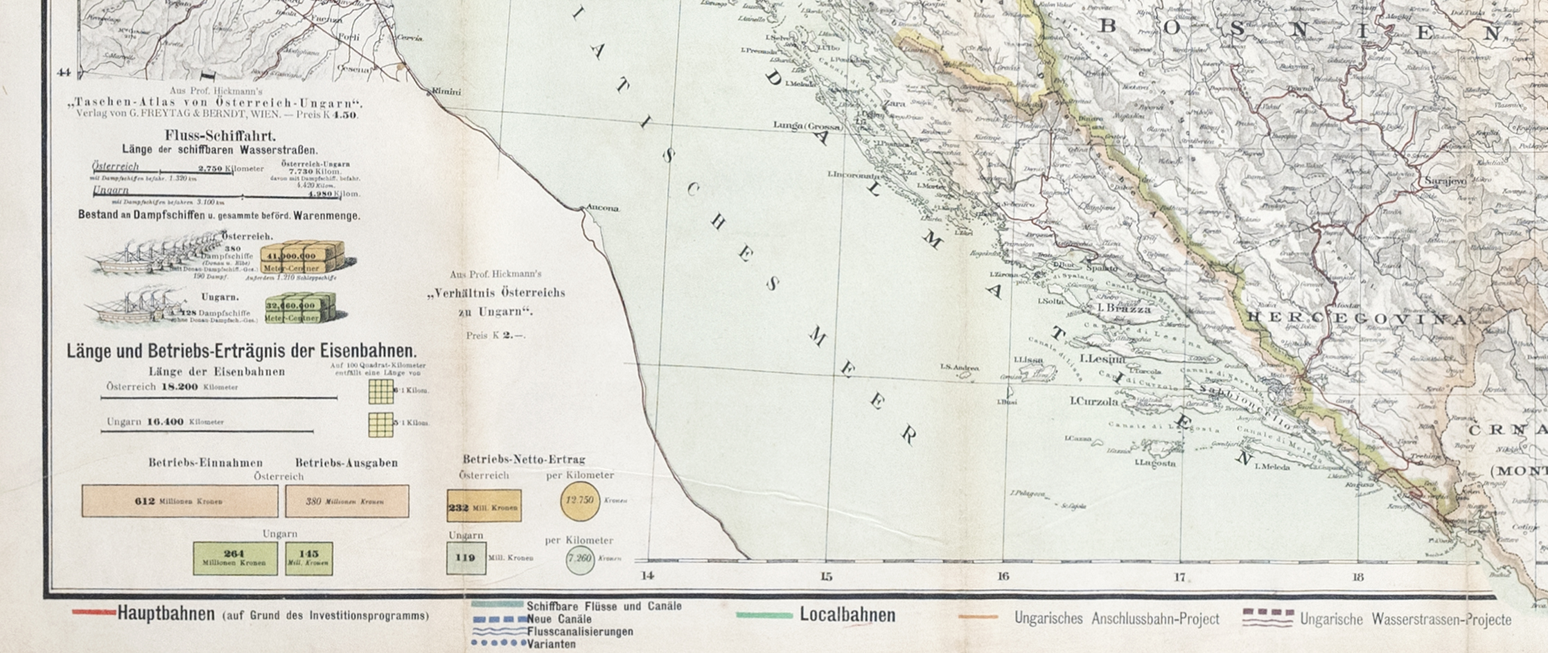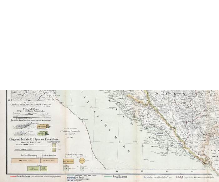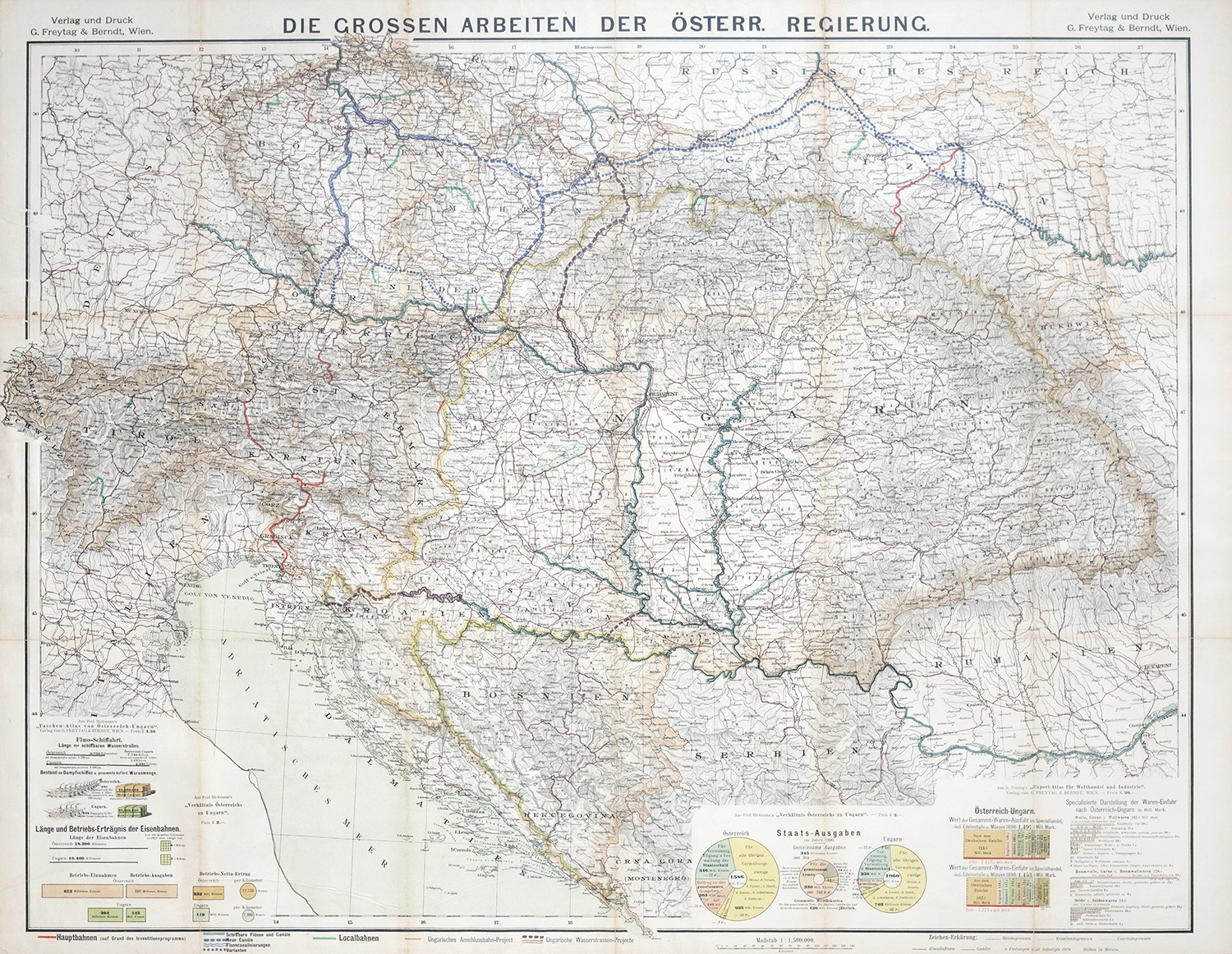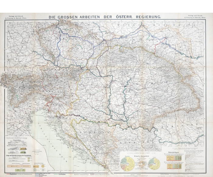 Карта Австро-Угорської імперії, надрукована у Відні картографічним видавництвом «G. Freytag & Berndt». На карті позначені заплановані (інвестиційна програма) залізниці, канали та водні шляхи, представлена статистика з питань торгівлі, державних витрат та транспорту. Наприкінці ХІХ ст. до Австро-Угорської імперії входили такі українські землі, як Буковина, Галичина та Закарпаття.
