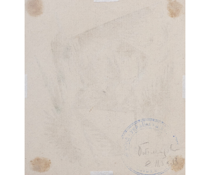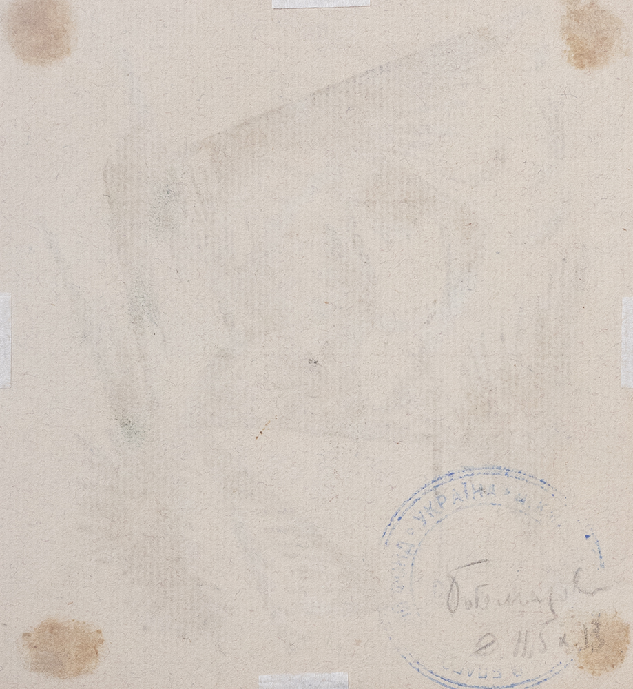 Провенанс: На звороті аркуша у правому нижньому куті міститься круглий штамп із написом по колу «Міжнародний благодійний фонд. Україна. м. Київ», а в центрі «Ігоря Диченка». Ігор Диченко (1946 -2015) — відомий київський колекціонер, мистецтвознавець.