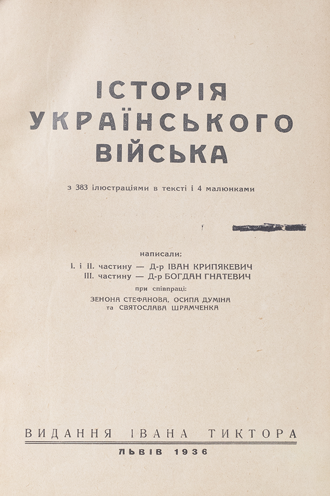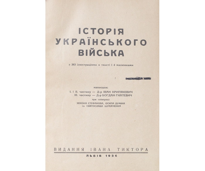 Перше видання «Історії українського війська» за редакцією І. Крип’якевича та Б. Гнатевича у співпраці з З. Стефановим, О. Думіним і С. Шрамченком. Фундаментальна колективна праця являє собою огляд розвитку українського війська від найдавніших часів. Книга складається з трьох частин: «Військо княжих часів», «Запорозьке військо», «Збройні сили сучасної доби». Остання охоплює часи Українських січових стрільців, Центральної Ради та Гетьманщини, містить характеристику Української галицької армії та об’єднаних українських армій.