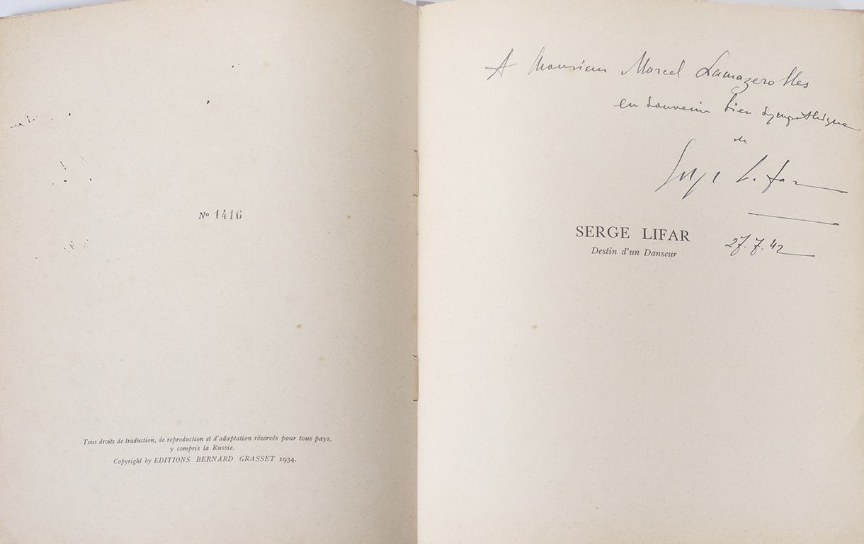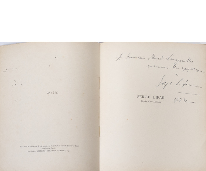 Провенанс: на с. 5 дарчий напис чорнилом з автографом Сержа Лифаря і датою «27.7.42».