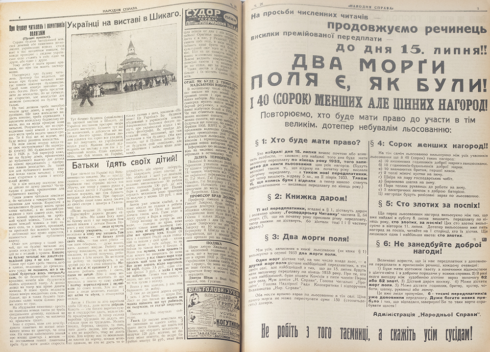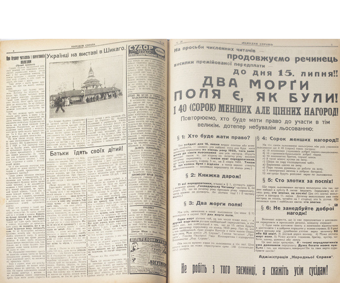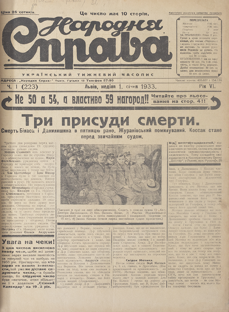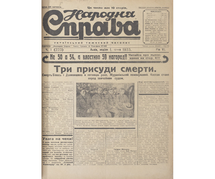 За короткий час цей тижневик став одним із найпоширеніших періодичних видань, зібравши понад 30 000 передплатників. Однією з причин такої популярності була нова практика — матеріальна допомога передплатникам у зв’язку із загибеллю худоби або втратою житла і майна під час пожежі. Поданий лот є збіркою номерів газети «Народна Справа» за 1933 рік.