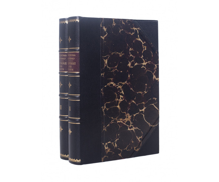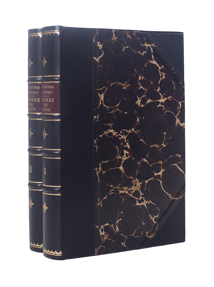 У складених («мармуровий» папір, шкіра) палітурах. Орнаментально-шрифтове тиснення золотом на корінці. Збережено оригінальні обкладинки. Незначні потертості та забруднення. На титулі першого тому власницький підпис і печатка «N. Szafowal».