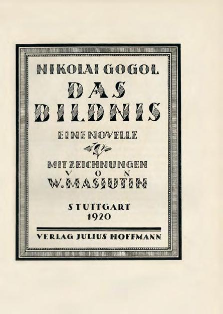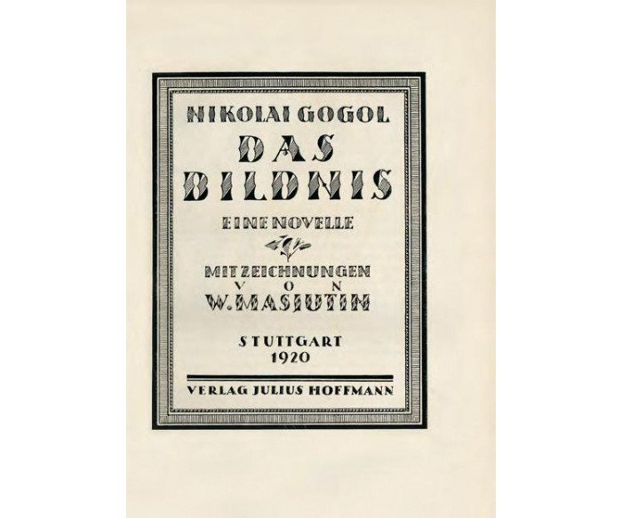 Гоголь М. Портрет: новела. / іл. В. Масютина; Пер. німецькою А. Еліасберга. Stuttgart: Verlag Julius Hoffmann; Spamersche Buchdruckerei in Leipzig. [6] s., 96 s.: ill. — 25 × 17,7 × 1,1 см. В індивідуальній складеній палітурі. Незначні забруднення, потертості, втрата корінця. Книга має художню, наукову, історико-культурну цінність і становить колекційний інтерес. Прижиттєве видання ілюстратора.